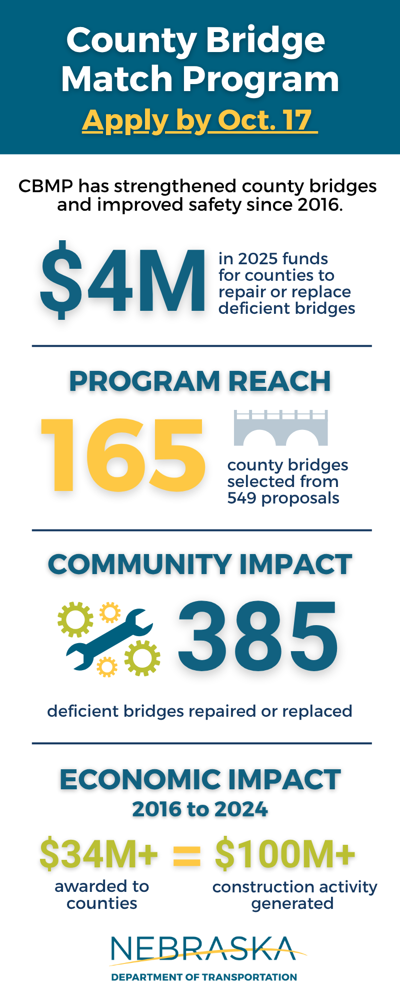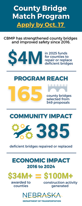 Every September, NDOT's Local Assistance Division opens the County Bridge Match Program (CBMP), giving counties an opportunity to strengthen local infrastructure and improve safety for travelers across Nebraska. Now in its 10th round of funding, CBMP will award $4 million to counties, empowering them to collaborate with local agencies and NDOT to streamline the replacement and repair of structurally deficient county bridges across the state. By addressing critical bridge needs, CBMP strengthens rural transportation networks that support agriculture, commerce, and everyday travel.