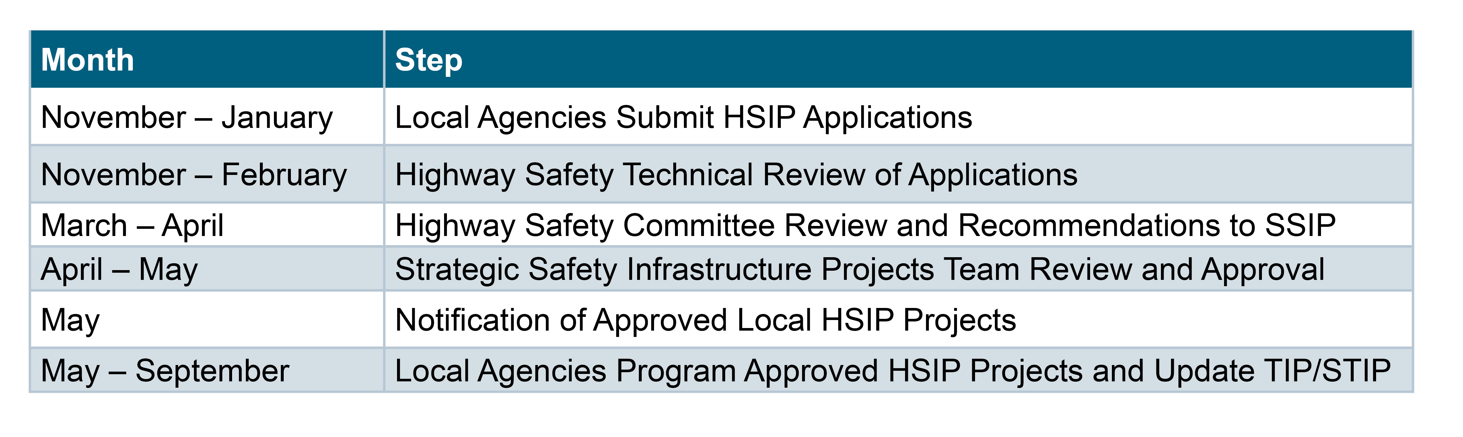 HSIP applications received by January 31st each year will move through the application review and approval process schedule shown below. If any deficiencies are identified in the HSIP application during the technical review, the LPA will have the opportunity to correct the deficiencies to continue in the current application cycle. If the received request has been determined to have good quality and potential safety improvement, the proposal will be presented to the NDOT Highway Safety Committee. The LPA will be given the option of presenting the proposed project to the Committee if so desired.