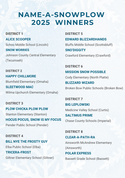 This fun competition is also a way to educate students (and future drivers!) about winter safety and snowplow drivers – who play a vital role in keeping Nebraska roads clear and motorists safe during the winter months. They also help ensure that emergency vehicles can get to those who need their services. NDOT's snowplow drivers often work long shifts in challenging conditions, and we want students to better understand this essential work while also learning how to stay safe around snowplows. Check out our classroom resources to the right.